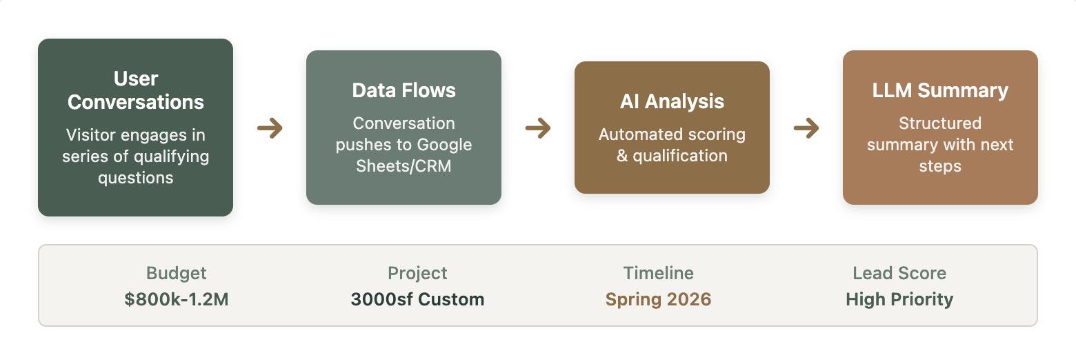 Here's the approach: fewer knowledge sources, more structured conversation flows. When users chat with these systems, they're essentially filling out a conversational contact form. All of this data pushes to Google Sheets or your CRM, and then AI automatically structures and scores each potential lead.